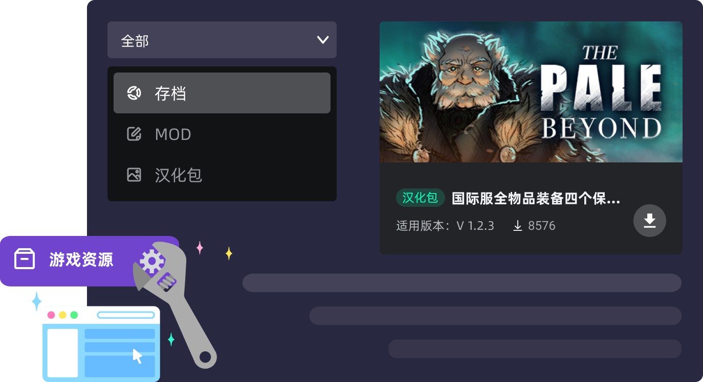 集中游戏周边所有工具和资源:加速器、修改器 云游戏、插件、存档、MOD、汉化包等等。