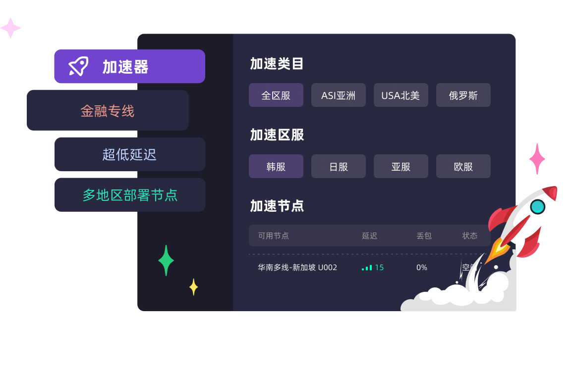 金融专线,超低延迟 全球多地区部署节点,提供各区服稳定加速线路 支持2000+游戏加速,多项核心黑科技,防卡顿、防延迟